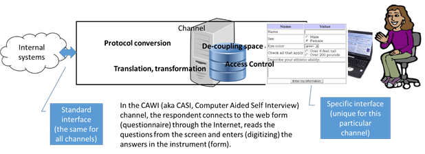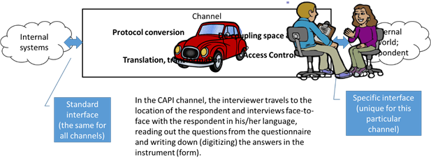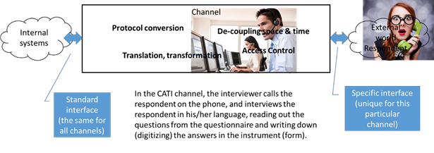 202. The CATI channel presents a different interface on the outside, namely the sound waves the are transmitted from/to the telephone. Note, that in this case the channel uses equipment (the telephone network and the respondent’s extension) that is not owned by the statistical organisation. Again, the interviewer will have the task to translate (digitize) the spoken word into digital information.