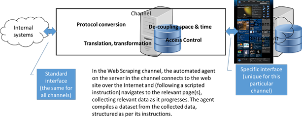 204. In web scraping, the channel uses the Internet to connect to some relevant web site and uses an internal script to navigate that web site and collect from it the relevant information. The script, executed by some automated agent, is the equivalent of the human interviewer, the external web site is the representation of the data provider (the respondent). Again, the channel uses some technology (such as the Internet) that is not owned by the statistical organisation.