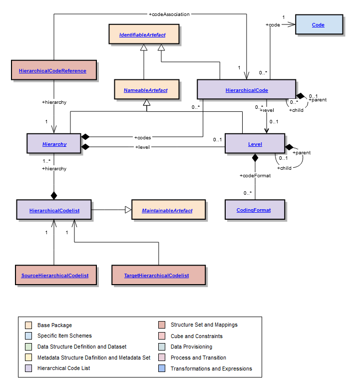 Codelist described in the section on structural definitions supports a simple hierarchy of Codes, and restricts any child Code to having just one parent Code. Whilst this structure is useful for supporting the needs of the DataStructureDefinition and the MetadataStructureDefinition, it may not sufficient for supporting the more complex associations between codes that are often found in coding schemes such as a classification scheme. Often, the Codelist used in a DataStructureDefinition is derived from a more complex coding scheme. Access to such a coding scheme can aid applications, such as OLAP applications or data visualisation systems, to give more views of the data than would be possible with the simple Codelist used in the DataStructureDefinition.