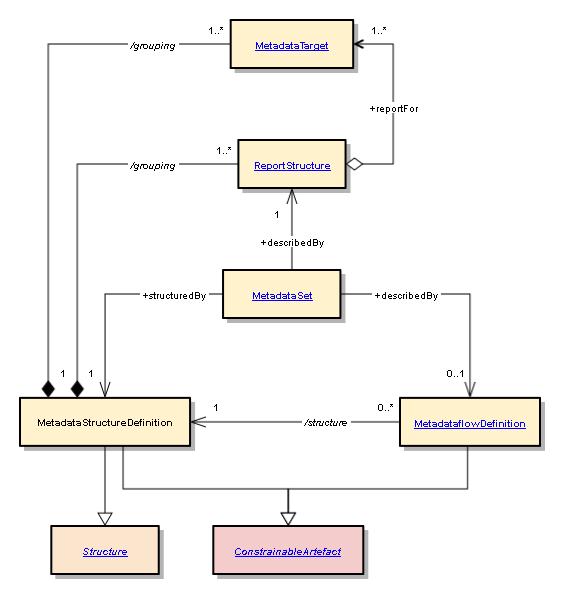 | MetadataStructureDefinition | Metadata Structure Definition and Metadata Set | Specification of the allowed content of a metadata set in terms of attributes for which content is to be provided and to which type of object the metadata pertain. | An MSD defines the reference metadata to be collected or reported by specifying the concepts required, how these relate to each other, their presentational structure and to which objects they are to be attached. |