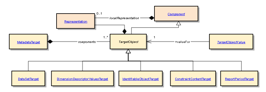 | TargetObject | Metadata Structure Definition and Metadata Set | TargetObject is an abstract base type from which all target objects of a metadata target are derived. It is based on a component. Implementations of this will refined the local representation so that the allowed values accurately reflect the representation of the target object reference. |