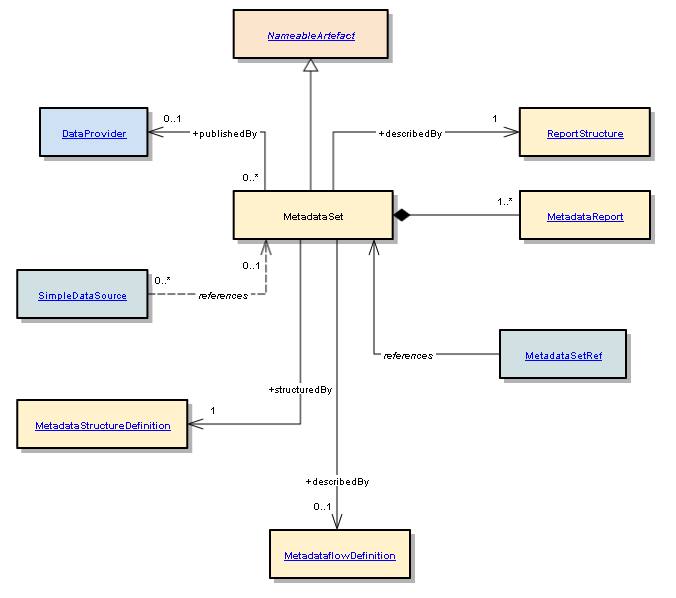 | MetadataSet | Metadata Structure Definition and Metadata Set | Organised collection of reference metadata. | In SDMX the metadata set must conform to the specification in a Metadata Structure Definition. The metadata set contains one or more reports, each report comprising the metadata content (a set of attributes and corresponding content), and the identification of the precise object to which the metadata are to be attached. The metadata can be attached to any SDMX artefact that can be identified (e.g. structural artefact such as a code, concept, dimension or a part of a data set such as a partial series key or observation). In SDMX the type of report defined in a Metadata Structure Definition is known as “reference metadata” which are typified by quality metadata but can contain any type of metadata. These metadata are generally not reported with the data (as data attributes in a data set) and are often collected to a different schedule to the data, are derived from separate (from the data) repositories and collected from/reported by systems different from the statistical data warehouse | Referential Metadata Set |